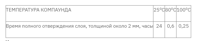 Поверхность образца должна быть чистой и свободной от загрязнений. При необходимости, особенно при использовании пористой основы, используйте разделяющий агент – восковую смазку П-126П или технический вазелин. Смешение Отвесить 1 массовую часть компонента А и 1 массовую часть компонента Б, вылить в чистую, сухую емкость и равномерно перемешать. Перемешивание может быть ручным или механическим (3-5 мин.), однако, долго перемешивать и повышать температуру выше 35°С не рекомендуется, так как существенно уменьшается время жизни компаунда. Для обеспечения полного смешения основы и отвердителя рекомендуется работать с малыми количествами компонентов. ВНИМАНИЕ!!! При неправильной дозировке компонентов, компаунд может не отвердиться. Рекомендуется удалять воздух в вакуумной камере (остаточное давление 10-25 мм Нg), при этом смесь будет увеличиваться в объеме, а затем оседать. После 1-5 минутного вакуумирования смесь должна быть проверена и при отсутствии воздушных пузырей может использоваться далее. При вакуумировании смеси ее объем увеличивается примерно в 3-5 раз, поэтому необходимо использовать достаточно большую емкость. Осторожно: продолжительное вакуумирование приведет к удалению летучих компонентов из смеси и может вызвать плохое отверждение утолщенных частей и появление нехарактерных свойств. Примечание: Если нет подходящего оборудования для вакуумирования, то воздушные включения могут быть минимизированы если смешать небольшие количества основы и отвердителя, а затем, используя кисть, нанести на образец тонкий слой. Oставить при комнатной температуре до тех пор, пока поверхность не очистится от пузырьков и не начнет затвердевать. После этого смешать следующие порции основы и отвердителя, и все повторить до получения готового слепка. Заливка смеси и отверждение. Вылейте смесь основы с отвердителем на исходный образец, стараясь избежать попадания воздушных пузырьков. Сделать это нужно в течение времени жизнеспособности компаунда, это время, в течение которого компаунд остается текучим (время жизнеспособности указано в паспорте на конкретную партию). Материал будет отверждаться до состояния эластичной резины в течении 24 часов. Конечные механические свойства будут достигнуты через 72 часа. За дополнительной информацией обращайтесь к таблице характерных свойств, указанных в паспорте. Если температура при отверждении значительно ниже чем 23°С, то время отверждения увеличивается. Есть возможность значительно ускорить процесс вулканизации, увеличивая температуру компаунда. Примерное время и скорость вулканизации приведены в таблице: Использование при повышенных температурах. Отвержденный компаунд Пентэласт-750 может эксплуатироваться длительное время при повышенных температурах. Однако, длительное пребывание при температурах выше 2000С приведет к потере эластичности компаунда. Нагрев до температуры выше 250 °С не рекомендуется.